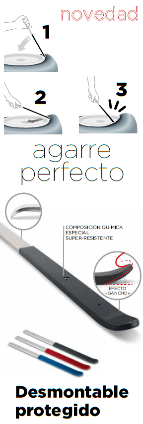 Desmontable con un ángulo mejorado que permite agarrar más eficazmente el neumático sin dejar que se escape, gracias a su efecto <<gancho>>.